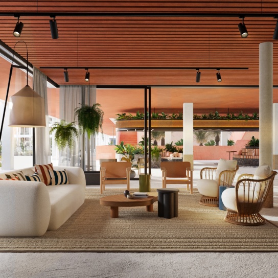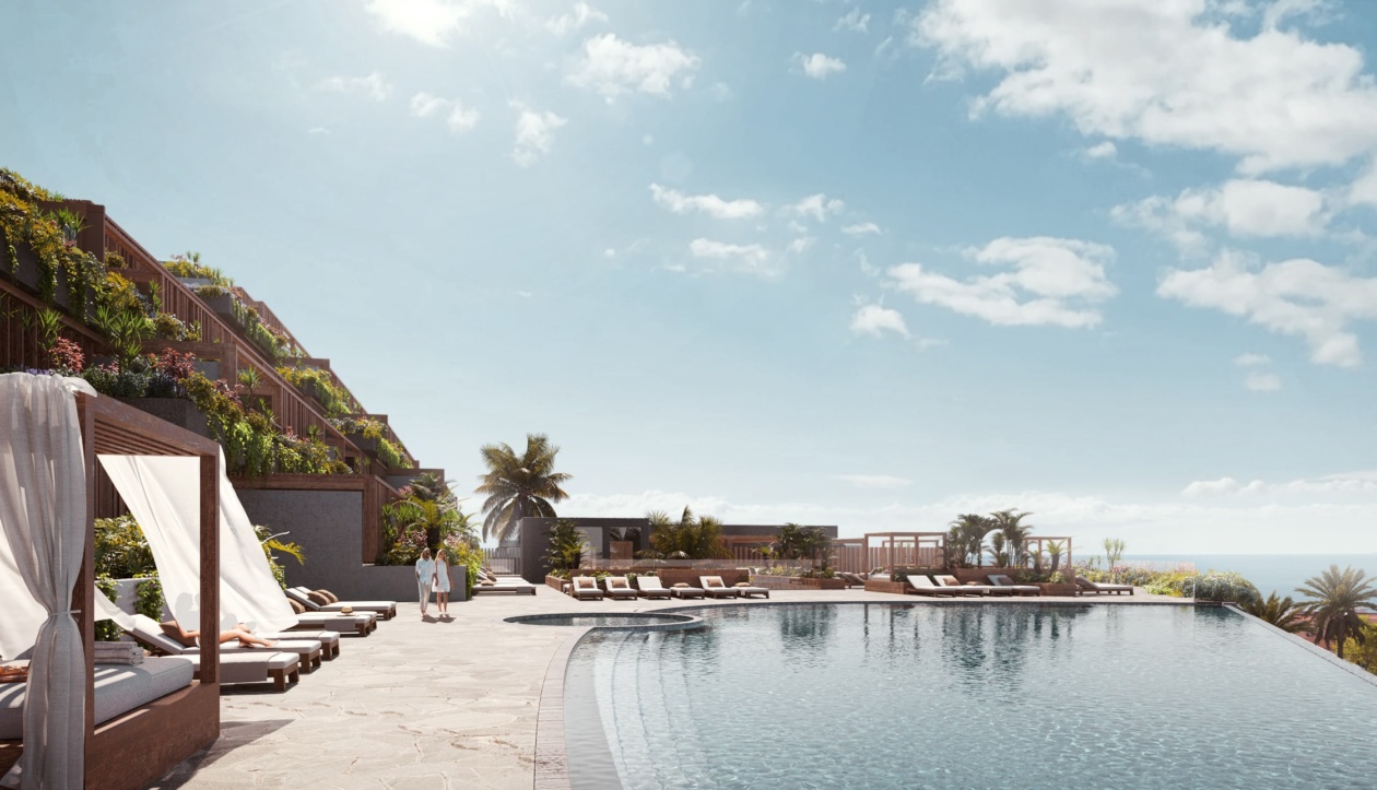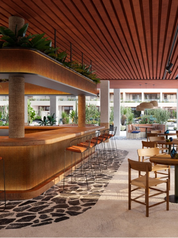 Entre la recepción y las piscinas y cerca de todos los apartamentos, se puede acceder a los vestuarios, café-bar, gastroteca, mercado gourmet y zona de coworking.