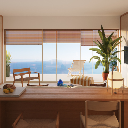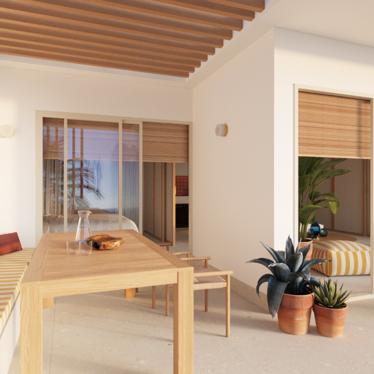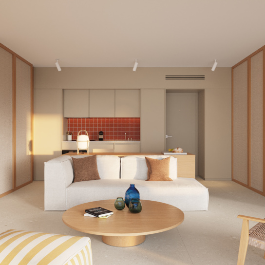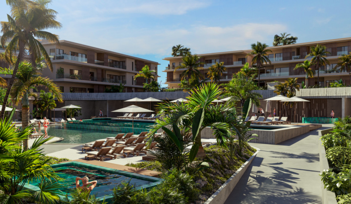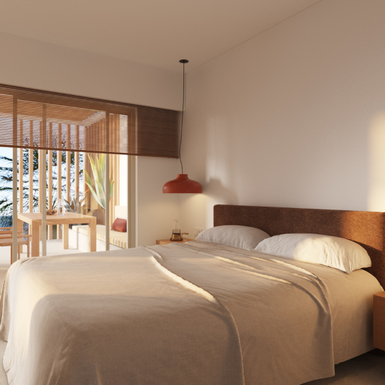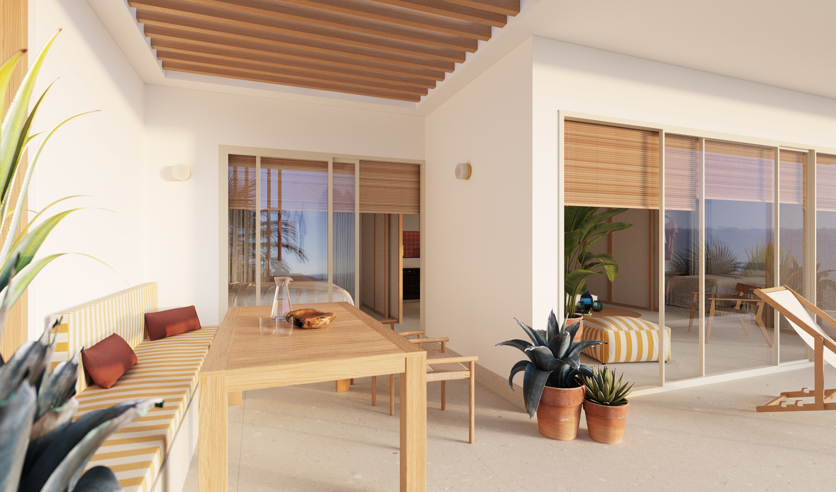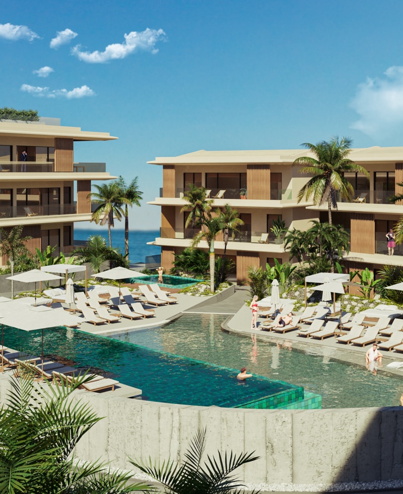 El resultado es un resort de apartamentos que pivota sobre un eje central de zonas comunes diseñadas para el disfrute y el co-living. El complejo se integra mediante dos niveles con las características del terreno y el entorno. Esto permite crear un resort sostenible, pensado para respetar la isla y formar parte de ella.